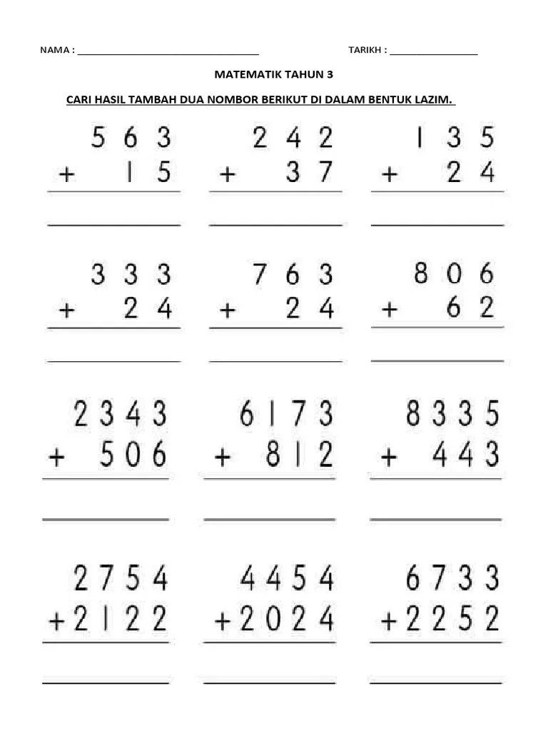 Matematik tahun 1(tambah bentuk lazim). Tambah (tambah mudah)menggunakan kaedah bentuk lazim berdasarkan ayat. Play this game to review mathematics. Tolak mudah · belajar yuk! Operasi campuran bilangan bulat · pembagian . You can do the exercises online or download the worksheet as pdf. Soalan matematik tahun 1 operasi tambah gongsyam. Asas tolak bentuk lazim tanpa mengumpul semula online worksheet for tahun 1. Ini akan membiasakan murid dengan pelbagai bentuk penyelesaian masalah. Latihan matematik tahun 1 pdf berdasarkan kurikulum kssr semakan. Anda seorang guru matematik sekolah rendah tahap 1?anda kehabisan sumber bahan bantu mengajar atau kesuntukan masa membuat soalan latihan tambahan operasi . Laman utama tutoria l 3 latihan 3(1) latihan 3(2) tutoria.